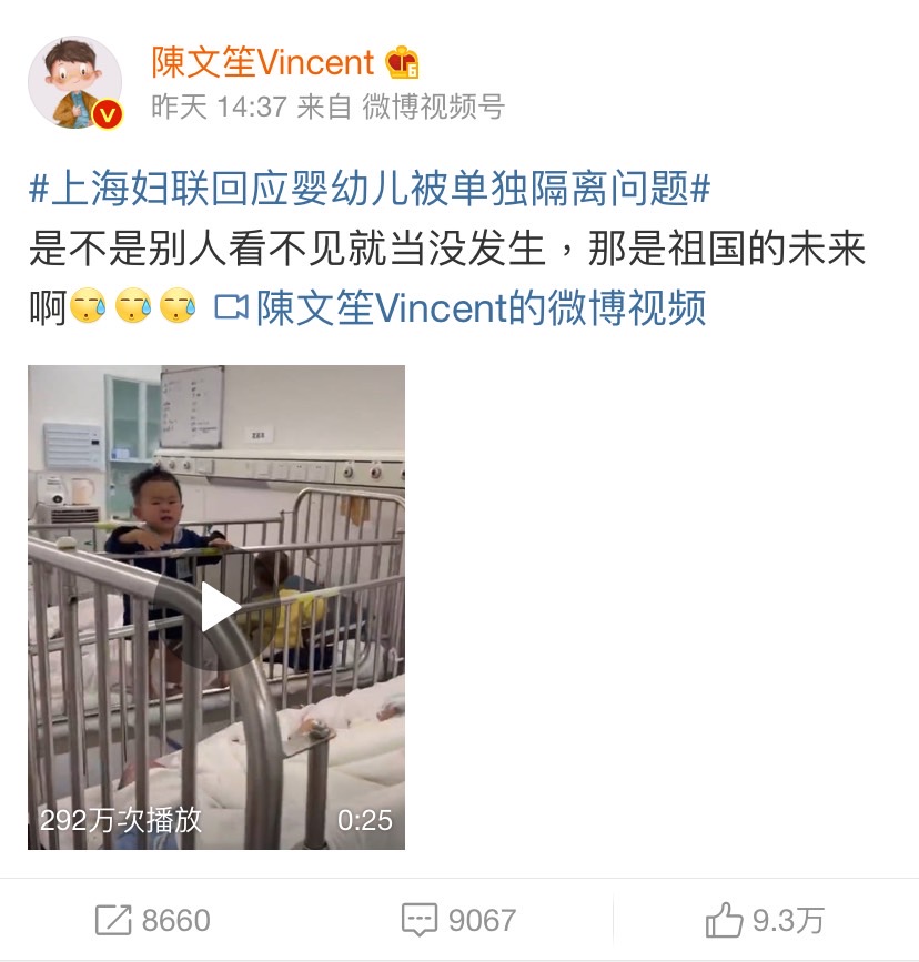 影片流出引來中國網友痛罵,“是不是別人看不見就當沒發生,那是祖國的未來啊”、“天啊,我拼死也不讓帶走我的孩子”、“都是有孩子的父母哪裡看的下去。是我死也要陪著他們”、“嬰幼兒統壹隔離,不知道是誰想出來的”、“上海官員,防疫做得不到位,現在連小孩子都不放過了?視人命如草芥!”。