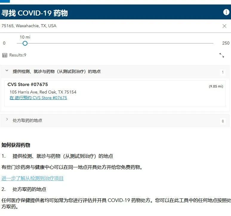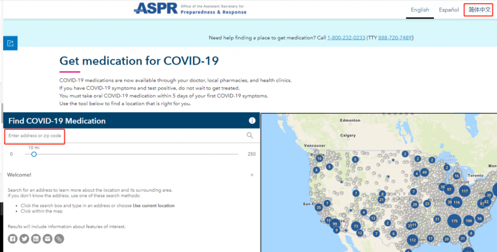 第壹步:當懷疑自己感染新冠病毒時,可以通過網站定位,選擇語言,輸入地址或郵政編碼,搜索自己附近的“Test to Treat”治療點。點擊預約即可。如不方便上網,可在美東早上8點-24點,撥打電話:1-800-232-0233 (TTY 1-888-720-7489)