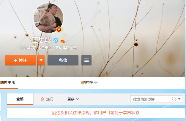 4月19日消息,今日,王思聰微博帳號被禁言,其微博頁面顯示,
