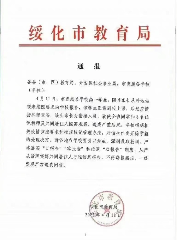 通報具體內容為,4月11日,綏化市直屬某學校高壹學生,因其家長從外地返綏未按照要求向學校報備,該學生正常到校上課。後經疫情指揮部查實,該生家長為密接人員,致使全班同學和8名任課教師及共同居住人隔離觀察,造成嚴重後果。學校根據相關疫情防控要求和校規校紀管理辦法,對該生作出開除學籍的處理決定。通報時間為2022年4月18日。