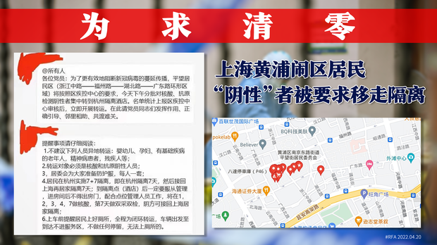 封城下的上海,新冠病毒感染者未見減少。黃浦區平望居委會向居民發通知,立即對核酸、抗原檢測陰性者集中轉到杭州隔離酒店。當地居民說,政府將陰性居民轉移到杭州隔離,留下陽性感染者,這讓很多人感到詫異。