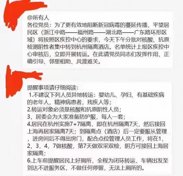 位於上海市中心黃浦區核心的南京東路街道平望街居委,周贰(19日)向轄區居民發出通知:為了更有效地阻斷新冠病毒的蔓延傳播,把平望區,包括浙江中路、福州路、湖北路及廣東路環形區域,按照區疾控中心的要求,當天下午分批對核酸、抗原檢測陰性者集中轉到杭州隔離酒店。還稱,名單統計上報區疾控中心審核後,立即開展轉運。