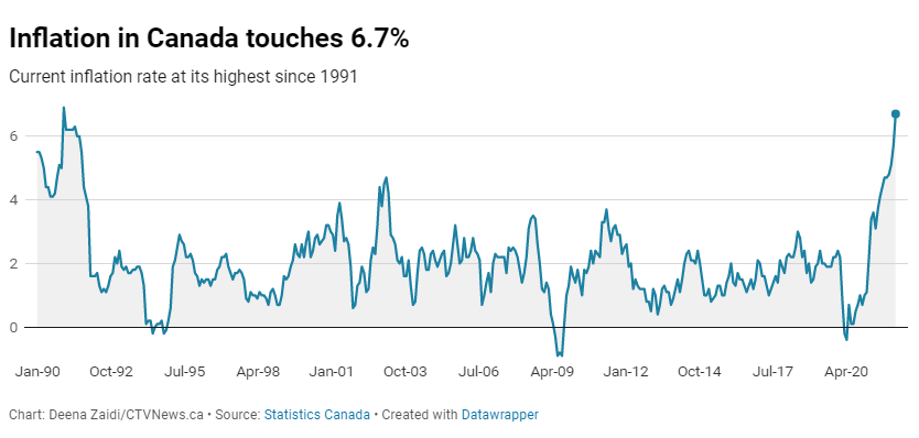 受到歐洲戰爭和供應鏈問題的影響,加國3月的通脹加速,達到6.7%。