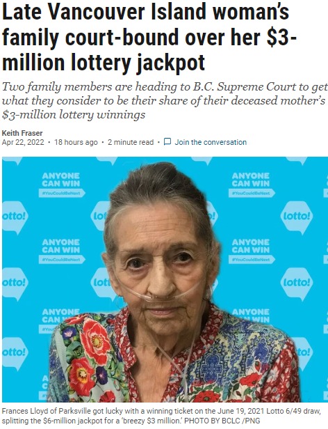 (加西網綜合)溫哥華島壹名老婦去年買彩票中了300萬加幣,由於今年去世前沒有留下遺囑,兩個成年子女正在起訴他們的兩個兄弟姐妹,要求平分這份彩獎。