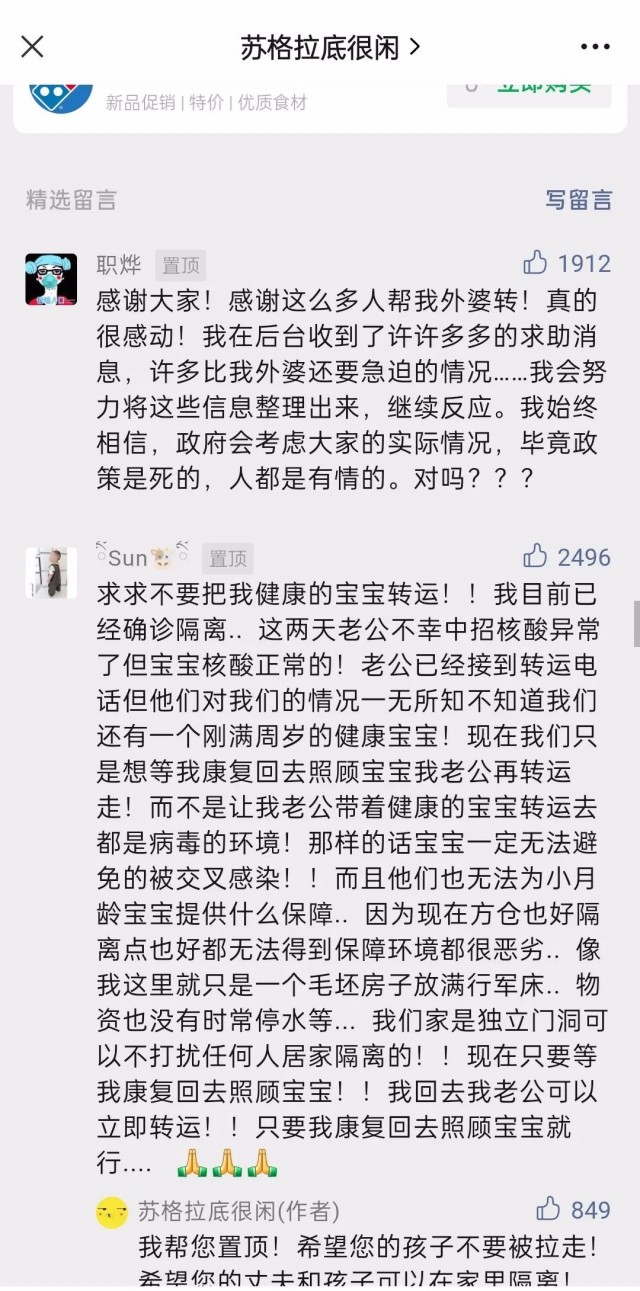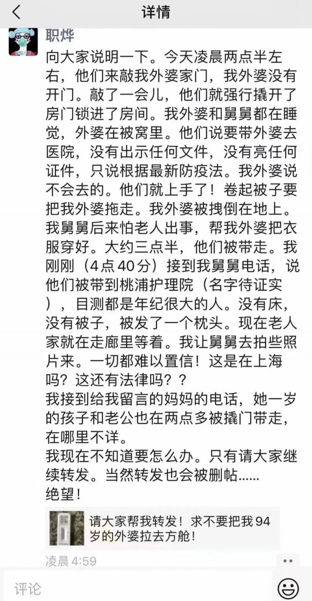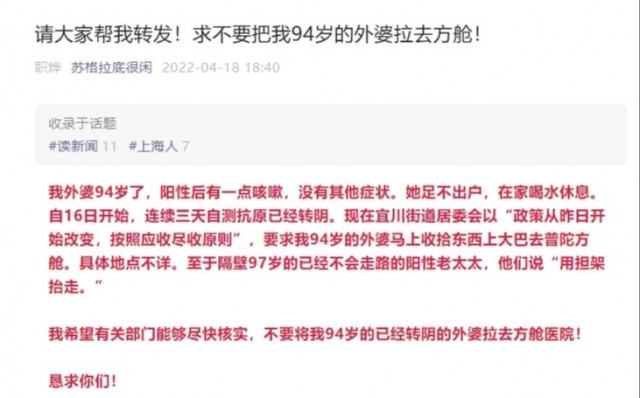 這篇文章的作者稱,其94歲的外婆和74歲的舅舅因此前核酸檢測曾有陽性,於4月19日凌晨3點被轉運隔離,引發網民廣泛關注。