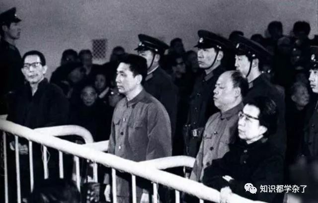 審判"肆人幫"法庭現場,右起:張春橋,王洪文,姚文元,江青