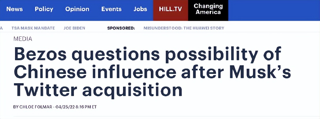 結果,在貝索斯的推波助瀾下,美國不少媒體也紛紛開始跟進炒作此事。其中,《國會山報》就在壹篇關於此事的報道中打出了這樣壹個標題:貝索斯質疑推特被馬斯克收購後可能受到中國的影響。