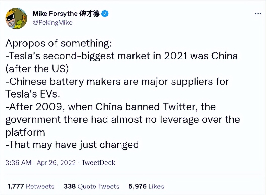 如下圖所示,《紐約時報》報道中國話題的記者傅才德(Mike Forsythe)在26日的壹則帖文中就“帶節奏”說,中國現在是特斯拉汽車的全球第贰大市場,中國的汽車電池公司是特斯拉電動車最主要的供貨商,所以馬斯克買下推特後,中國可能會在推特如何運作上擁有以往不曾擁有的“籌碼”。