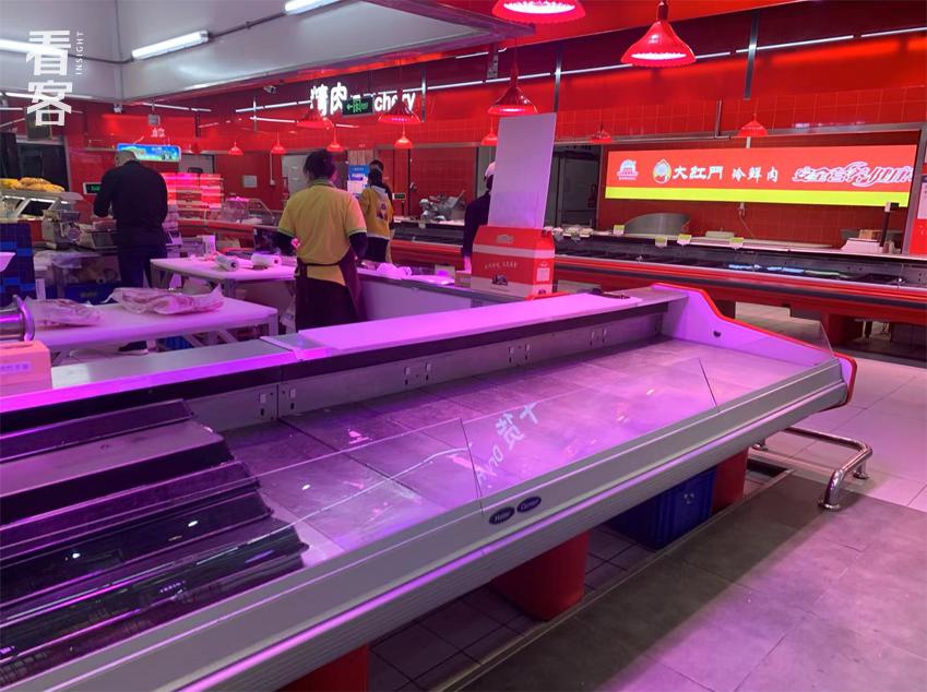 晚上 9 點,北京市昌平區龍德廣場家樂福超市,肉類貨架徹底空了。