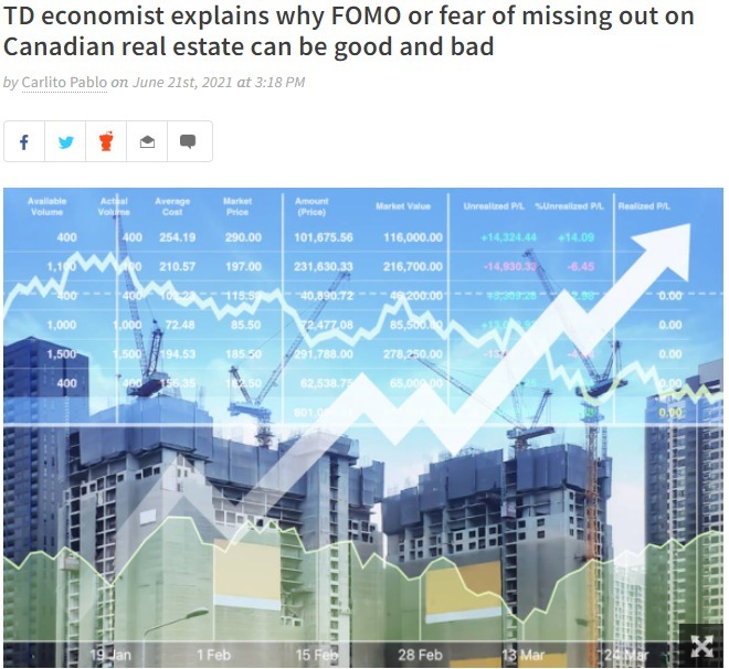 TD 銀行的經濟學家也多次提出,加拿大房價的重要推手是加拿大人害怕錯過這波行情、以後買不到房子的心理嚴重影響了房地產市場。