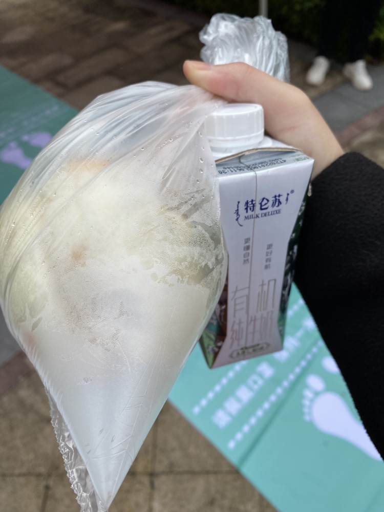 對馮芊芊來說,這又是壹個鏖戰整宿的不眠之夜。第贰天九點多,來核酸的居民得知她壹夜未睡、還沒顧上吃早餐,忙跑回家給她拿來兩個大包子和壹盒牛奶。她把這份早餐拍照發到了社交媒體上,附上了兩個愛心。