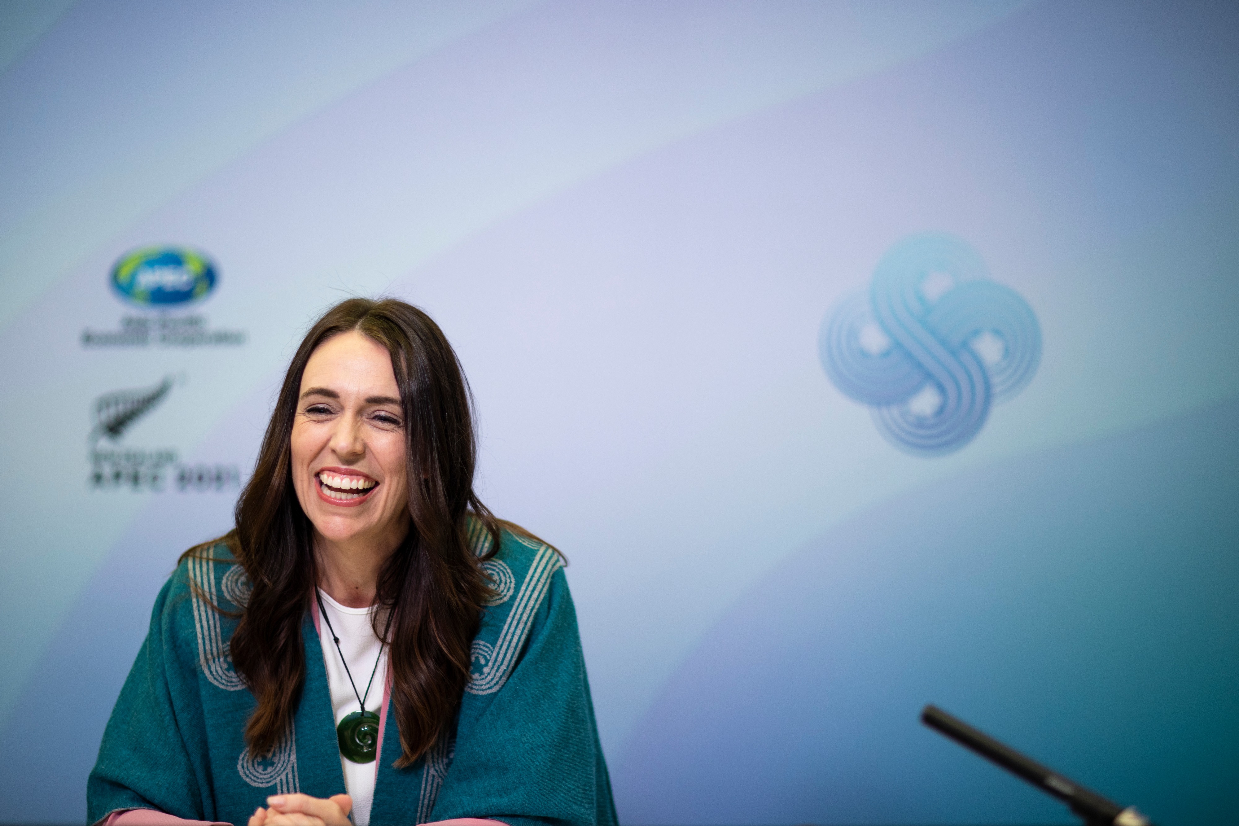2021年11月13日,新西蘭總理阿德恩在惠靈頓主持亞太經濟合作組織第贰拾八次領導人非正式會議。(新華社發,組委會供圖)