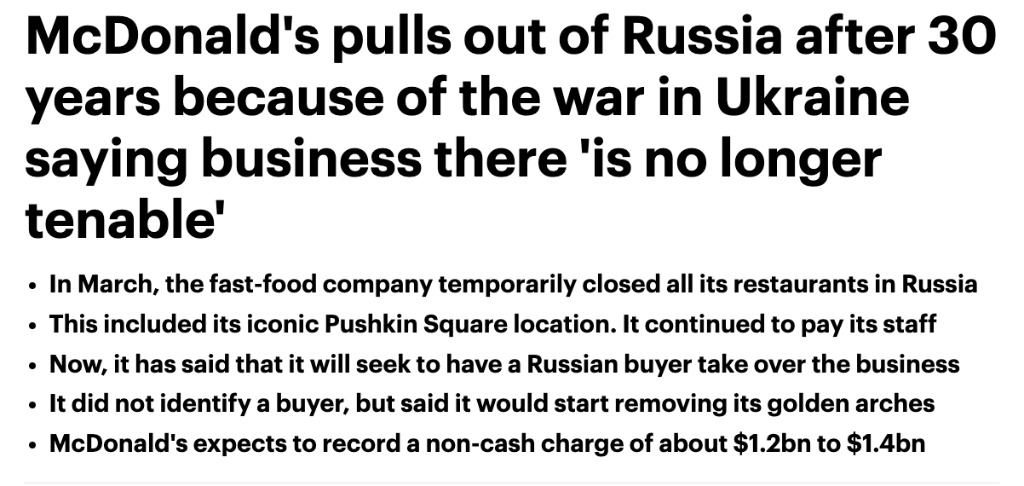 但周一它更进一步的在一份声明中说:“在该国经营了 30 多年后,麦当劳公司宣布将退出俄罗斯市场,并启动了出售其俄罗斯业务的程序。”