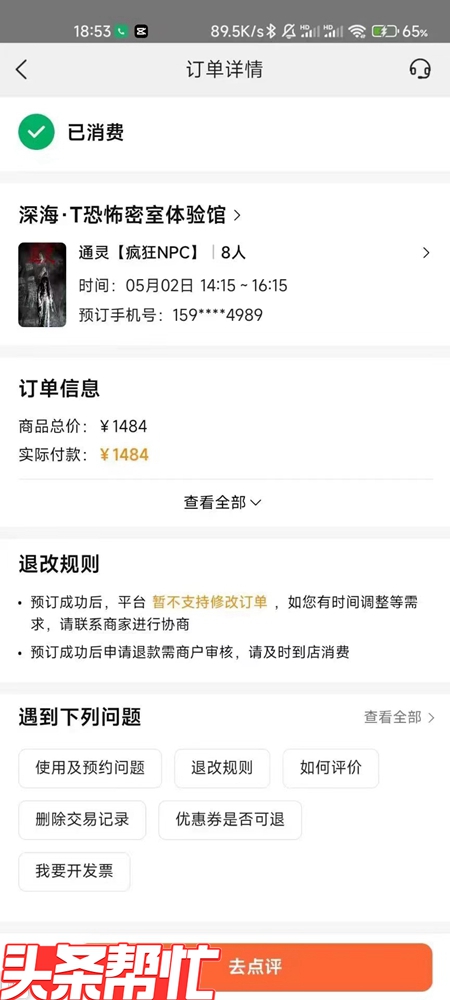 李女士說,事情發生於5月2日下午,她的兒子小明和其他幾位同學到深海·T恐怖密室體驗館內消費游戲,共計消費1484元。“由於游戲場所是壹處封閉的密室,燈光昏暗,還有NPC(非游戲玩家)追著,他在奔跑時就發生了磕碰,戴著的眼鏡被磕碎,劃破了皮膚。”