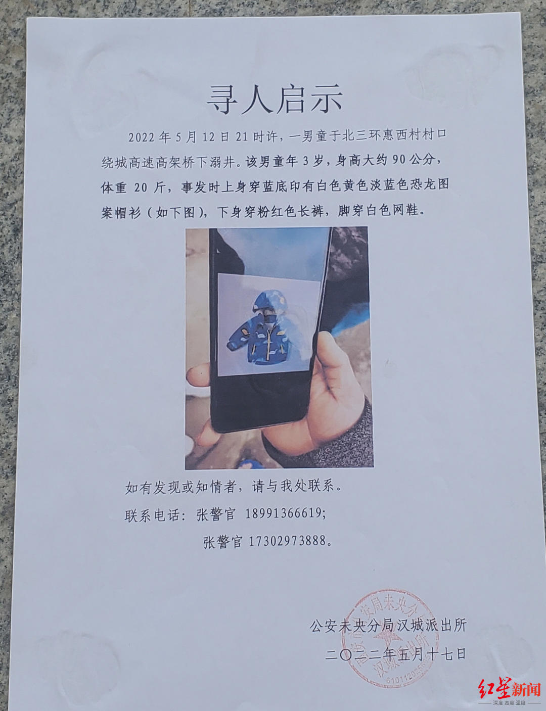 當地警方在村口張貼了關於3歲男童的尋人啟事。啟事稱,男童身高大約90厘米,體重20斤,事發時上身穿著藍底印有白色黃色淡藍色恐龍圖案帽衫,下身穿粉紅色長褲,腳穿白色網鞋。
