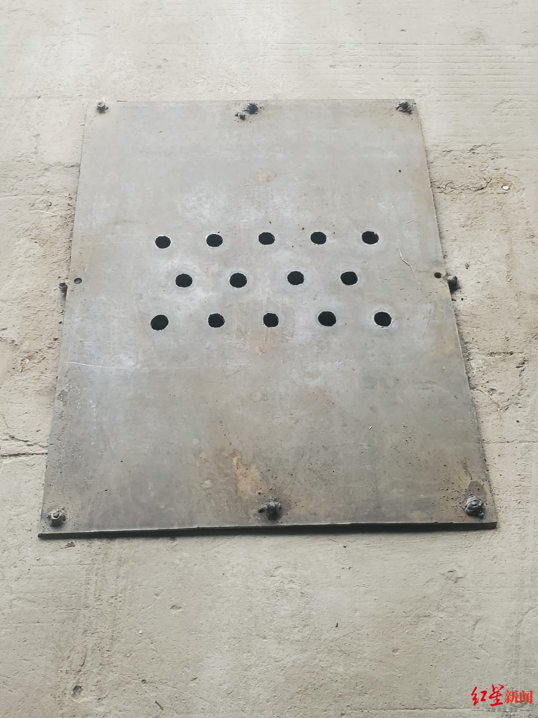 下午,洞口已新更換了壹塊長1米、寬80厘米、厚約10厘米的鋼板,肆周用8顆螺絲進行了固定,鋼板中間打了14個圓孔用於排水。