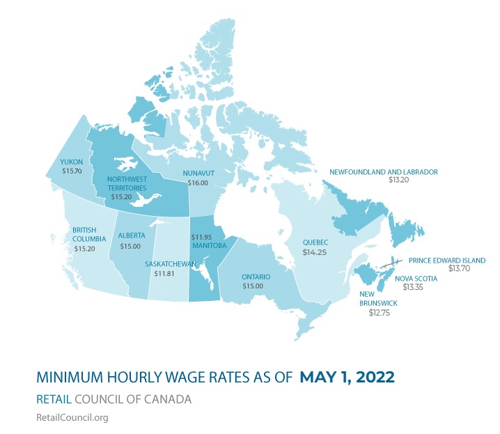 这是截止5月1号,加拿大各省和特区的最低时薪 。