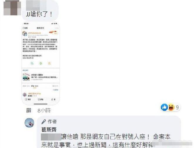 6 月 1 日報道5 月 31 日,台媒狗仔葛斯齊開直播錘汪小菲,還透露了林俊傑的 " 套房命案傳聞 ",稱其私生活混亂。葛斯齊表示,自己所說出來的話都有經過大腦,如果沒有證據,沒有其他東西佐證的話,會選擇不說。