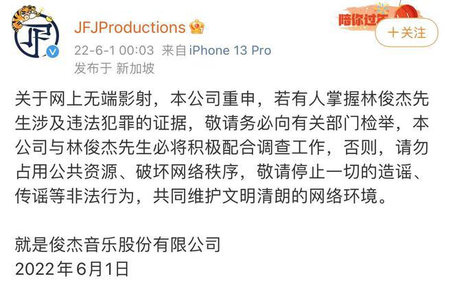 對此,6 月 1 日凌晨,林俊傑公司發聲明回應:" 若有人掌握林俊傑先生涉及違法犯罪的證據,敬請務必向有關部門檢舉,本公司與林俊傑先生必將積極配合調查工作。"