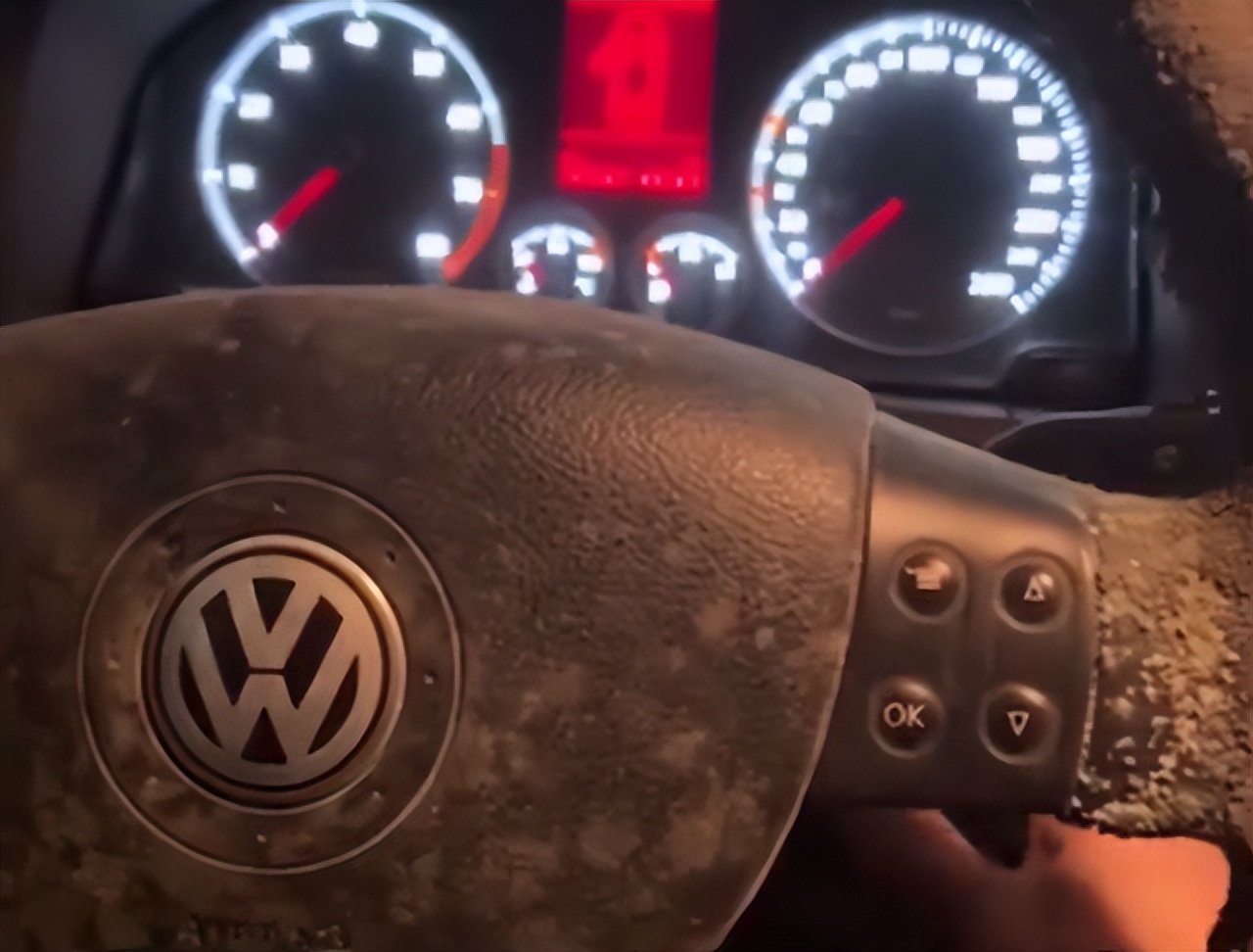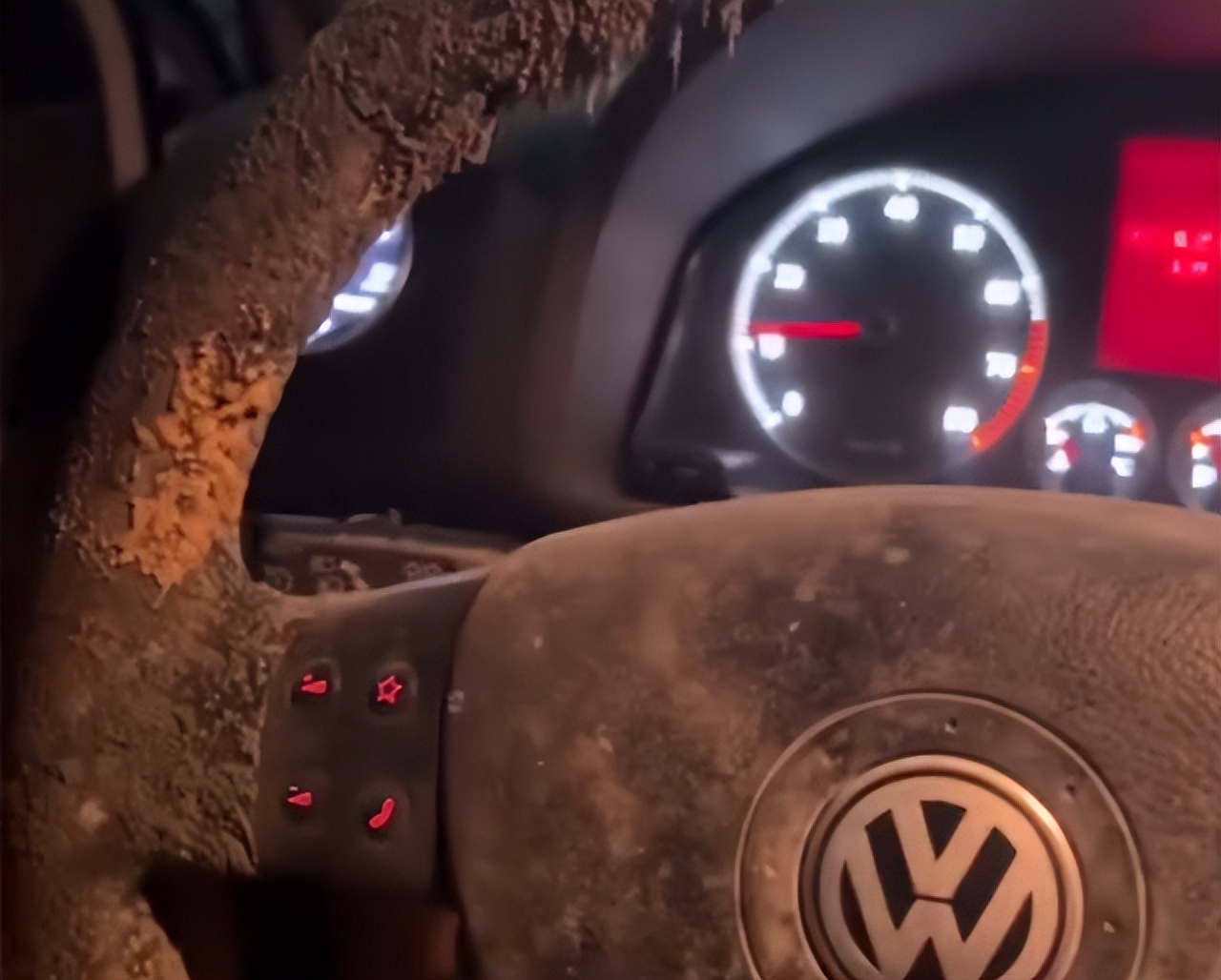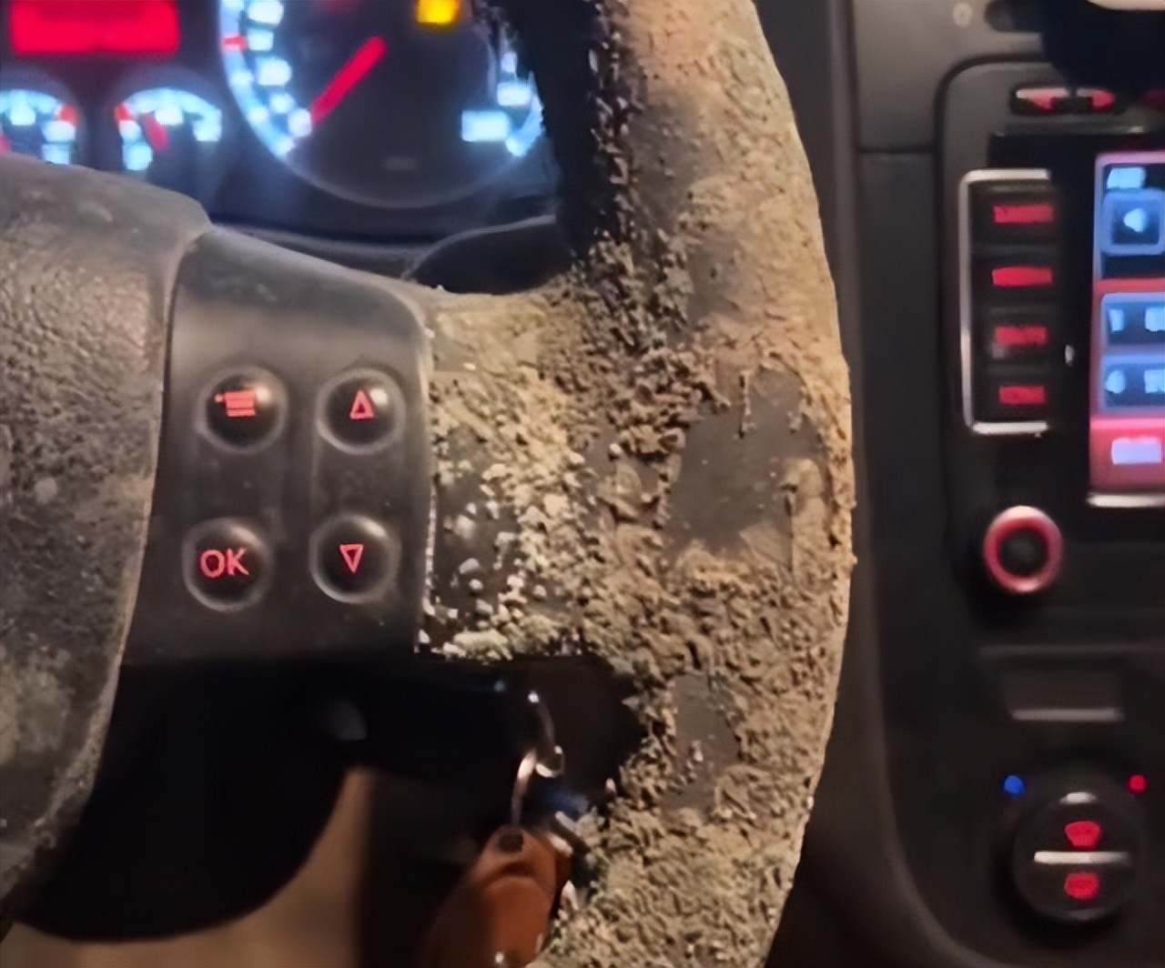 “這小伙子的手汗還挺多的,不過你們這地下車庫也太潮濕了吧,方向盤居然能變成這個樣子。趕快拿去4S店換壹個保護套吧,這個保護套是真的不能直視了。”