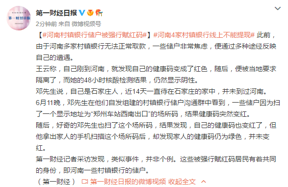 今天,200位河南村鎮銀行儲戶建的群,裡面的朋友都是突然之間健康碼變紅。他們有的去過河南,有的沒去過,還有位沈陽的儲戶說自己就看大家說這事兒,他就抱著好玩的心態掃了掃河南健康碼,結果直接被賦了紅碼。
