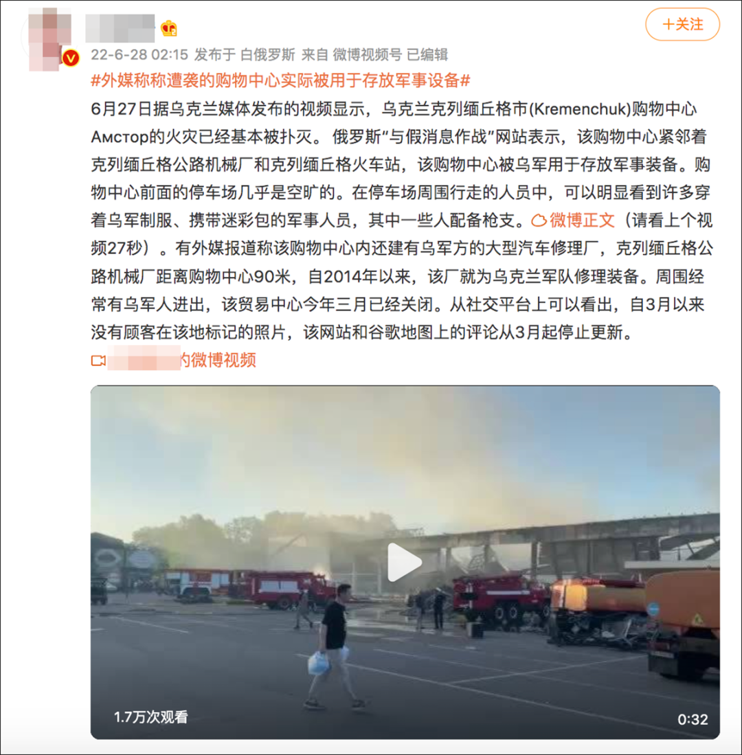 烏克蘭城市克列緬丘格壹家購物中心6月27日遭到俄軍導彈襲擊,中文網絡流傳說法稱,該購物中心今年3月已經關閉,被烏克蘭軍方用來存放軍事裝備。