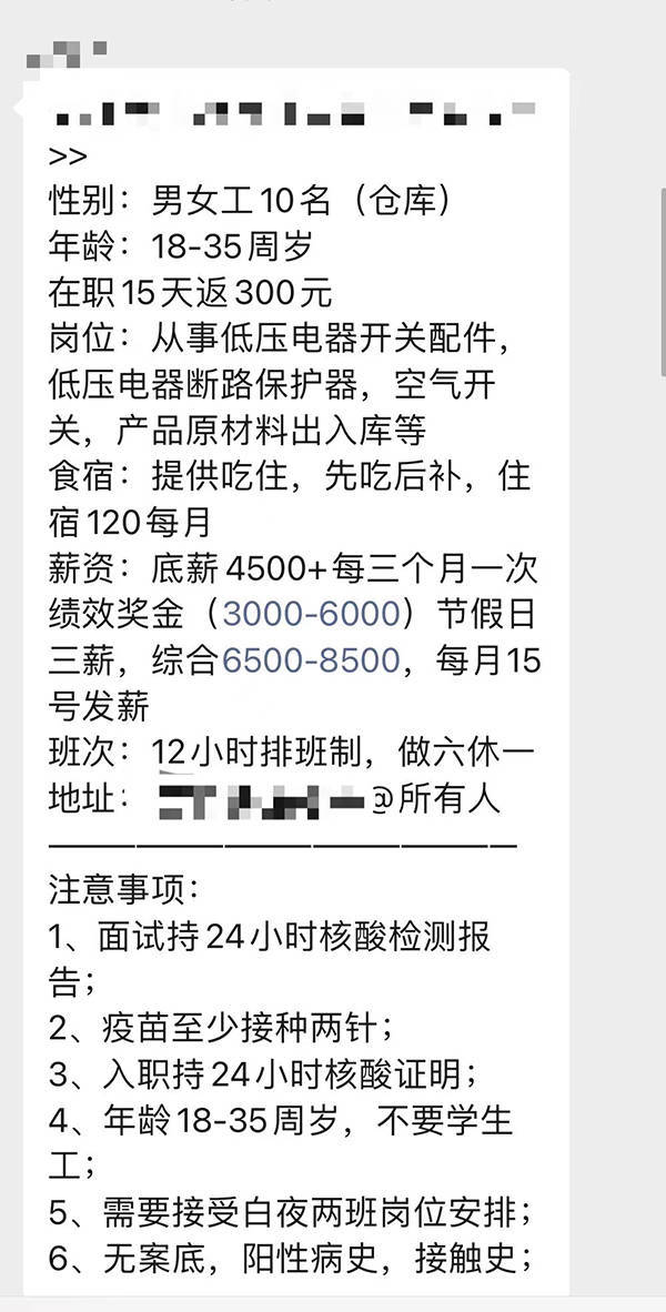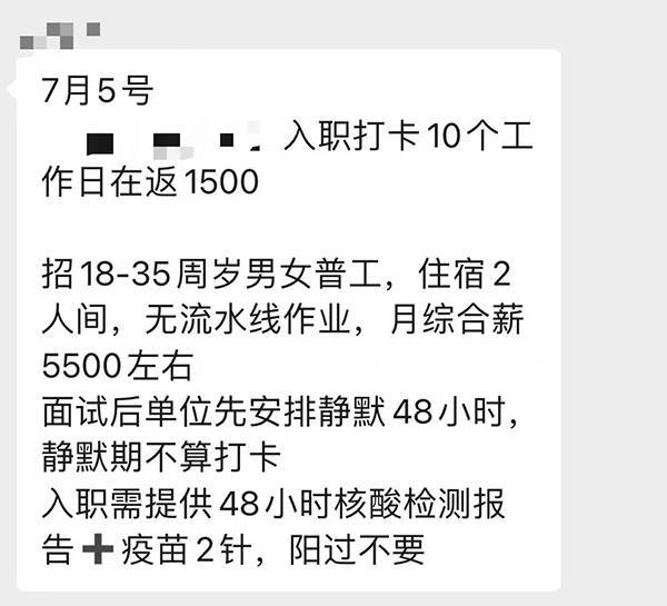 在方艙志願者群裡,有人發布壹家工廠的招工信息,其中明確“陽過的不要”。本文圖片受訪者 供圖