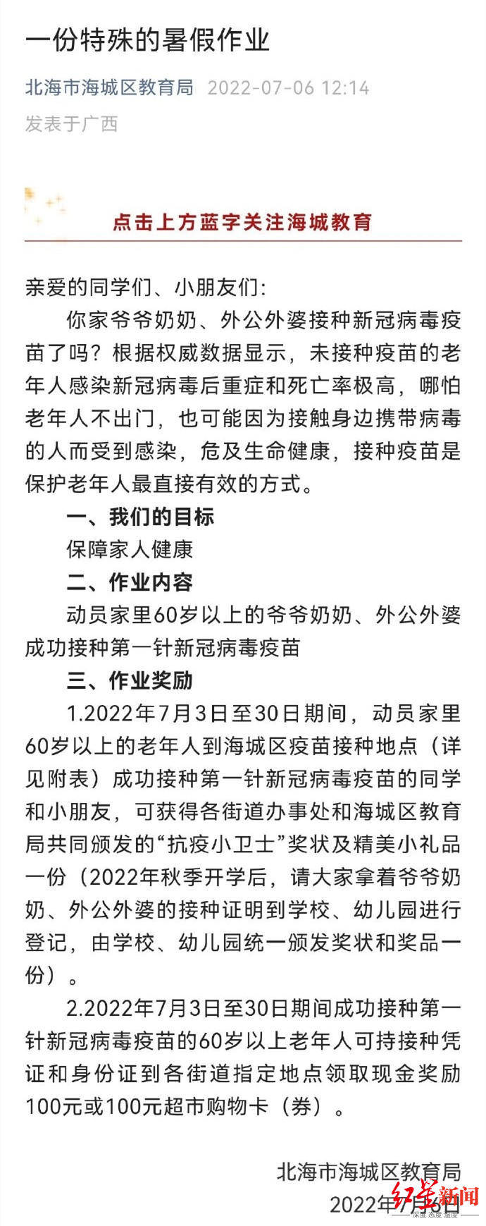 7月6日,廣西北海市海城區教育局的官方微信公眾號發布了壹篇文章《壹份特殊的暑假作業》,作業內容為,學校學生和幼兒園小朋友動員家裡60歲以上的爺爺奶奶、外公外婆,接種第壹針新冠病毒疫苗。