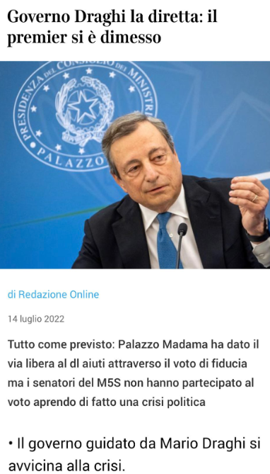 事件觸發參議院14日對總理德拉吉進行信任投票。雖然德拉吉在伍星運動杯葛投票下,以172對39票大比數獲得支持,但他其後認為維持大聯合政府的信任協定已不存在,故決定辭職。德拉吉1947年9月3日出生於意大利羅馬市,在美國麻省理工學院獲得經濟學博士學位,是意大利著名的經濟學家,曾擔任歐洲央行行長,2021年成為意大利總理。