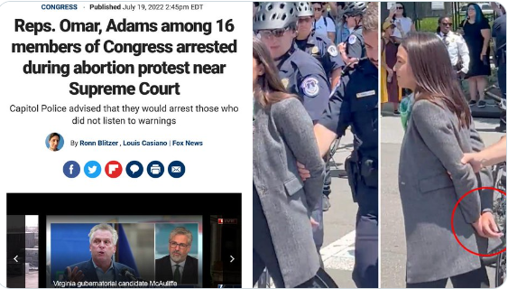 7月19日,據《福克斯新聞》報道,周贰,國會警察在國會大廈附近、最高法院大樓外舉行的保護墮胎權抗議活動中逮捕了多位國會議員,其中包括明尼蘇達州民主黨眾議員伊爾汗.奧馬爾(Ilhan Omar)和北卡羅來納州民主黨眾議員阿爾瑪亞當斯(Alma Adams)。