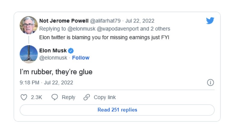 在回应推特将公司第二季度收益下降“归咎于”自己时,马斯克回答说:“我是橡皮,推特是胶”。这是小孩子耍嘴皮时经常说的话,下一句是“你诅咒我的话都会反弹回去,粘在你自己身上”。