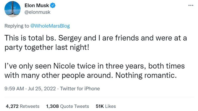 加西網報道:華爾街日報最近援引知情人士的話稱首富馬斯克與Google共同創辦人布林之妻妮可.沙納漢有染,稱馬斯克先生去年年底與沙納漢女士有過壹段短暫的戀情。