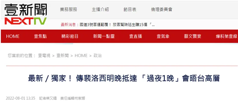 島內親綠媒體“壹新聞”8月1日發布所謂“獨家消息”,宣稱美國眾議院議長佩洛西壹行“很可能在明日(8月2日)訪台,並過夜1晚,會晤台高層”。除了這家綠媒的簡短消息,台灣(专题)《聯合報》同日說,美國《華盛頓郵報》稱佩洛西訪台可能落在8月2日晚上或3日上午,將經由馬來西亞來台灣。台“總統府”1日對此消息未予證實,僅說由外事部門回應。而台外事部門宣稱,目前沒有進壹步的消息分享,也沒有其他評論。而台灣中時新聞網也傳出“佩洛西最快明晚到台灣”的消息。