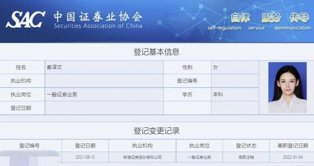 據媒體報道,中國證券業協會網站公示的登記信息還顯示,秦澤文曾供職於安信證券,登記時間為2021年8月12日至2022年1月4日,共4個多月。但秦澤文的 執業崗位為“壹般證券業務”,並未取得分析師資質。