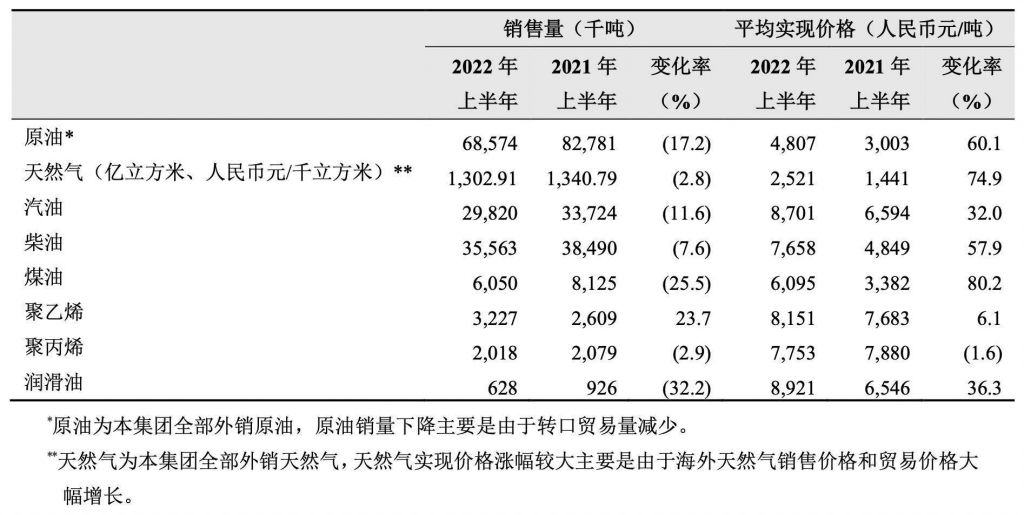中國石油2022年上半年和去年同期主要產品的對外銷售數量、平均實現價格及各自變化率