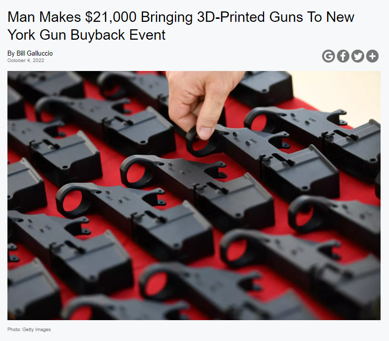 壹名男子聲稱利用紐約州槍支回購計劃的漏洞,通過3D打印的方式,打印出100多個槍支零件交給警方,賺了2.1萬美元。