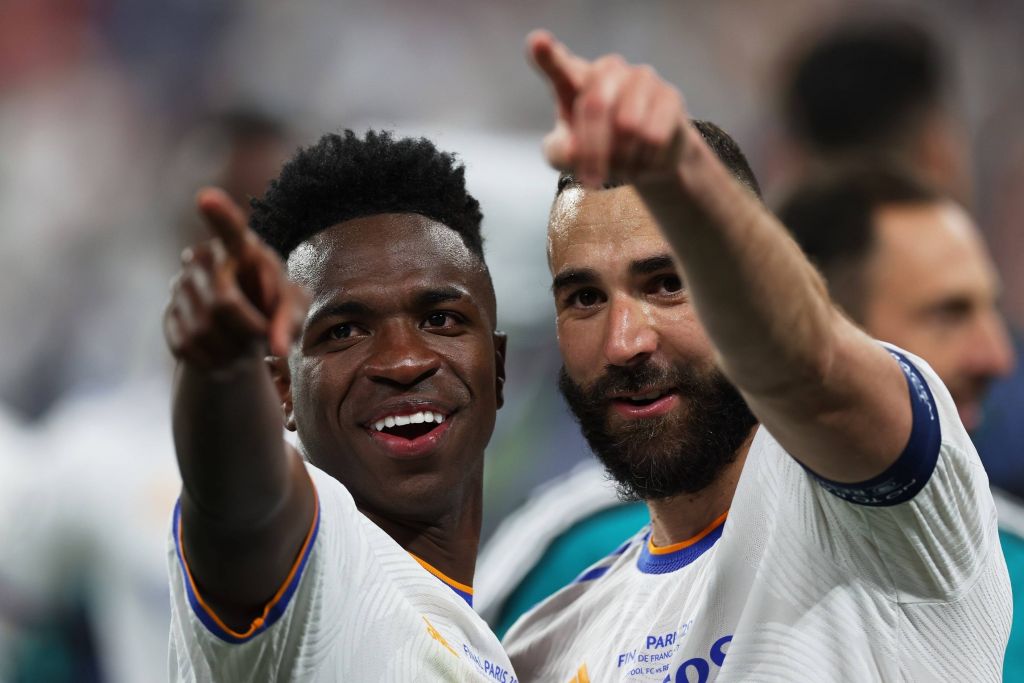 5月28日,皇家馬德裡隊球員維尼修斯(左)與本澤馬在比賽後慶祝球隊奪冠。圖片來源:新華社