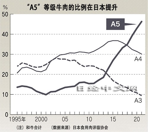 背後原因是“霜降至上主義”。牛肉進口自由化以後,日本開始大力生產細膩地含有雪花紋(網狀脂肪)的牛肉。1995年相當於“A5”等級的日本和牛比例為總體的14%左右,2021年則上升到了46%。