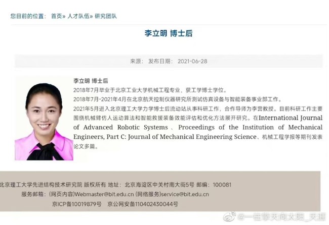 事後,網友扒出,這個女子是北京理工大學的李立明博士,是“先進結果技術研究院”的研究團隊人員。