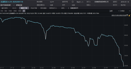 龍湖2028年到期、利率4.5%的美元債盤中壹度下跌12.6美分至20.1美分。截至發稿,報35美分。