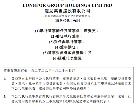 10月28日晚間,龍湖集團發布人事變動公告。公告顯示,吳亞軍因個人年齡及身體原因而呈請辭任公司執行董事、董事會主席、提名委員會主席、薪酬委員會委員、環境、社會及管治委員會委員、投資委員會委員及公司授權代表,並獲委任為公司戰略發展顧問,自2022年10月28日生效。