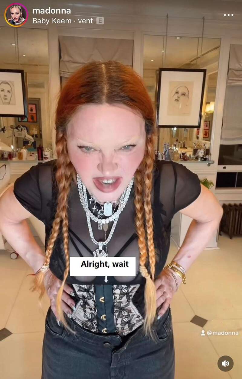當地時間11月3日,麥當娜在自己的社交媒體上分享了壹個短視頻,她跟著說唱歌手Baby Keem的歌曲《發泄》(vent)的音樂,邊唱歌邊擺出憤怒的表情,看樣子真的是在“發泄”。