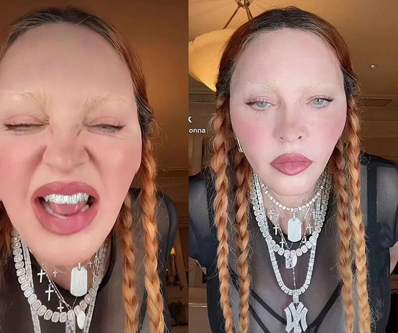 麥當娜還真不是沒有眉毛,而是把眉毛染成了白色,遠遠看去就像是沒有了壹般,眼睛上面光禿禿的,說不出的別扭。