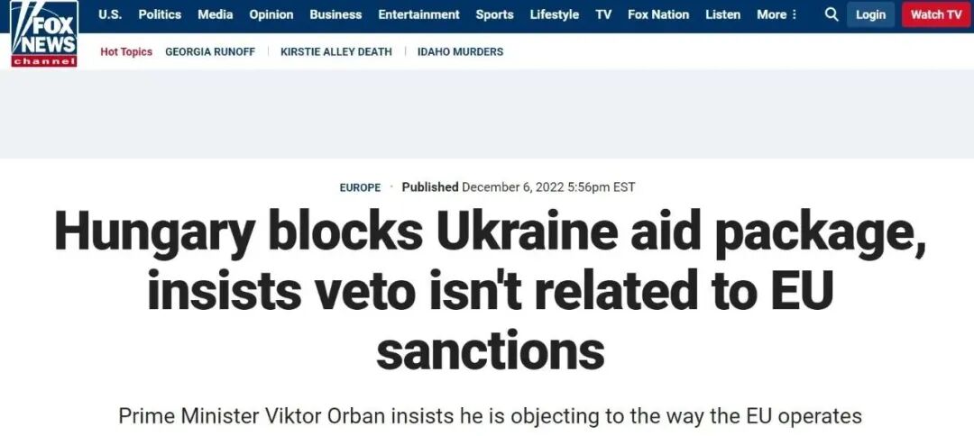 匈牙利阻止歐盟對烏克蘭援助計劃。圖片來源:美國福克斯新聞網報道截圖