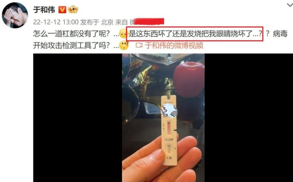 雖然於和偉的抗原結果是無效的,但從他“是這東西壞了,還是發燒把我眼睛燒壞了?病毒開始攻擊檢測工具了嗎”這句話來看,他已經感染了,而且發燒了,不過視頻裡他說話還挺清晰的,應該症狀比較輕。