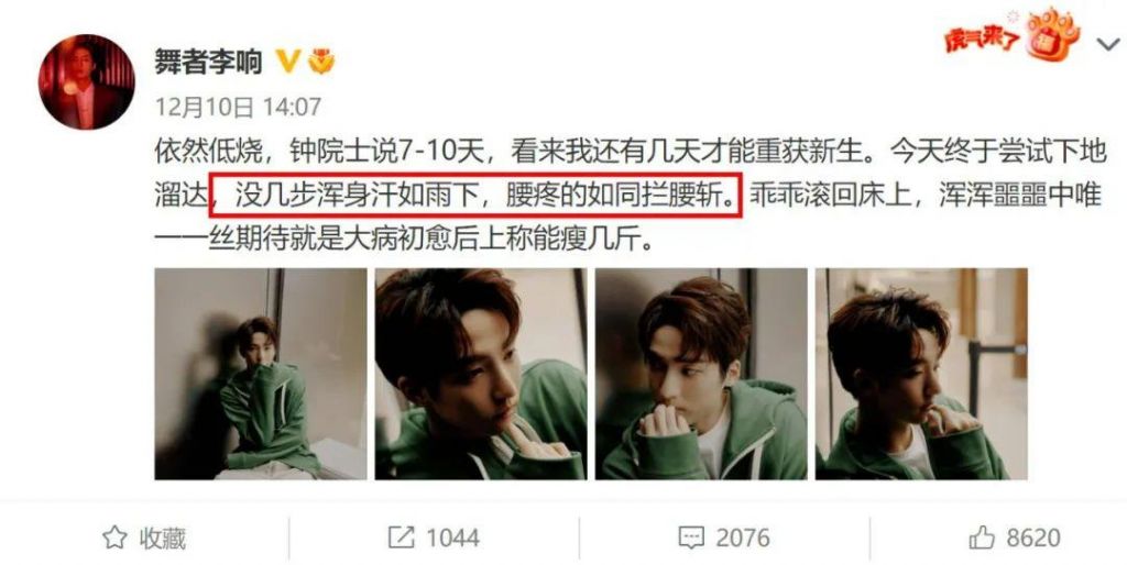 參加過《披荊斬棘的哥哥》的舞蹈家李響,已經感染幾天了,他雖然沒有發高燒,但是還挺嚴重的,休息幾天了,但身體還是很虛弱,“沒走幾步就渾身汗如雨下,腰疼得如同攔腰斬”。