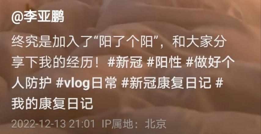 12月13日晚,李亞鵬在社交平台更新動態,透露出自己已經感染了新冠的事情,並配文稱“終究是加入陽了陽”這個隊伍。
