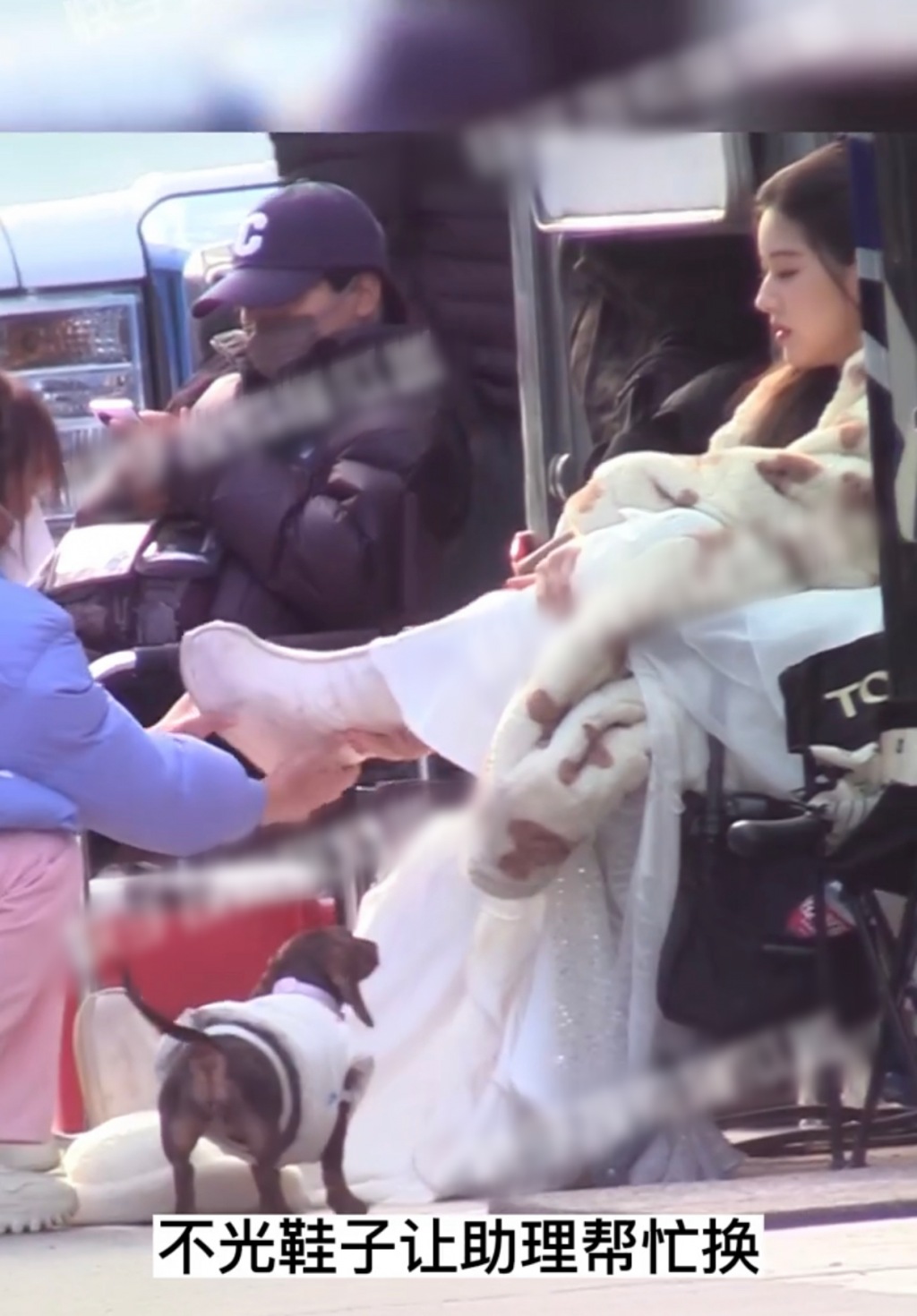 助理蹲在地上先是為趙露思脫下了鞋子,然後再熟練地幫她穿襪子,趙露思對這樣的場面似乎早就習以為常。她手上並沒有拿著劇本研究,甚至也沒玩手機,明明自己彎腰就能做的動作,非要助理伺候著。