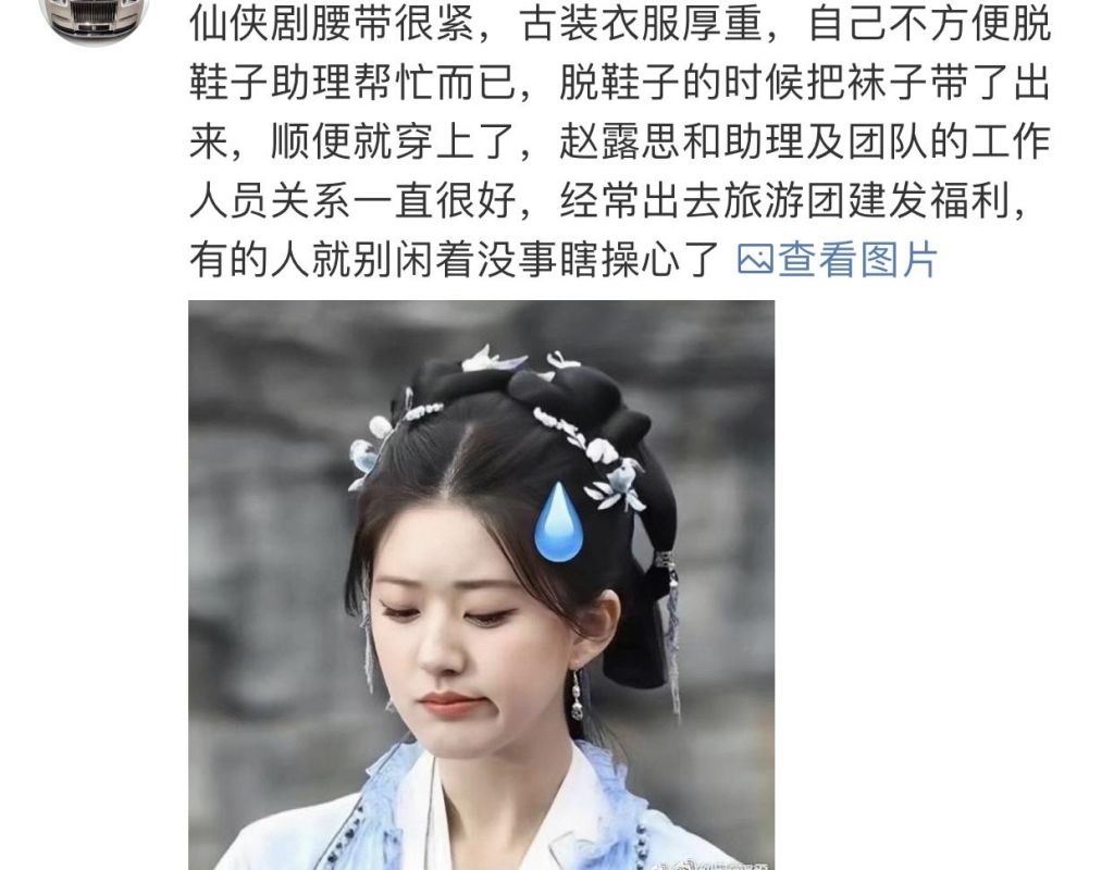 對此,粉絲的解釋說,趙露思拍的是仙俠劇,古裝衣服厚重,自己彎腰不太方便,助理為她脫鞋子不小心把襪子也帶出來了,所以才順手給她穿上。況且趙露思和團隊工作人員關系壹直很好,不存在把助理當丫鬟使喚的情況。