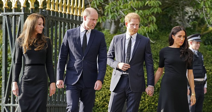 威廉王子夫婦與哈利王子夫婦難得同框,觀覽民眾對英國女王的獻花。 圖:美聯社(資料照)